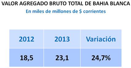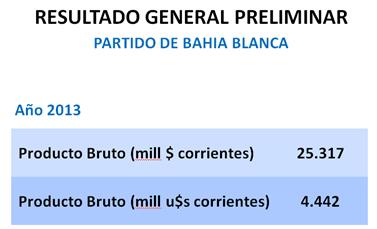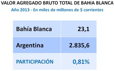 Durante el año 2013, el Producto Bruto del partido de Bahía Blanca ascendería a los 25.317 millones de pesos. Tomando el promedio anual del tipo de cambio oficial ($5,7 por dólar), arrojaría unos 4.442 millones de dólares.