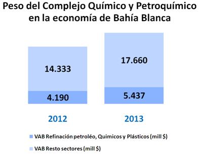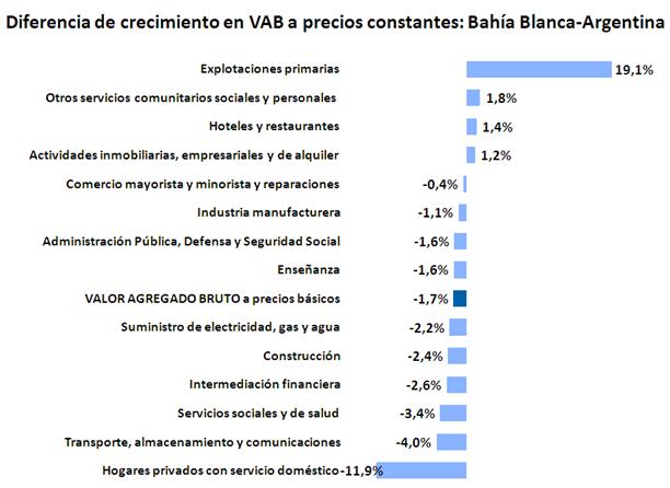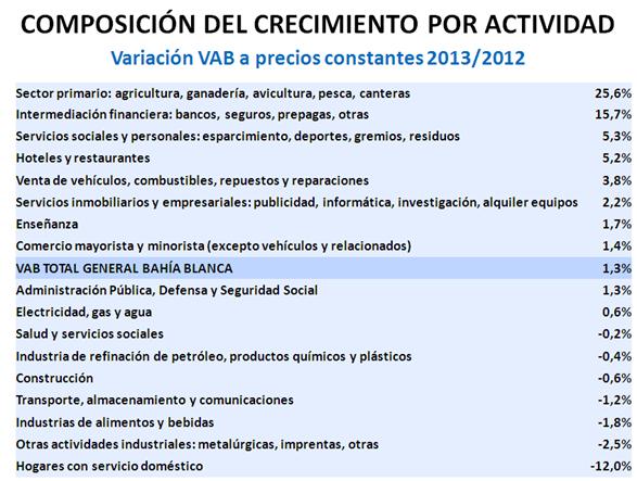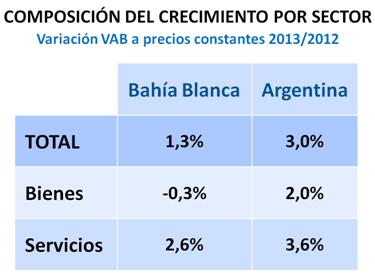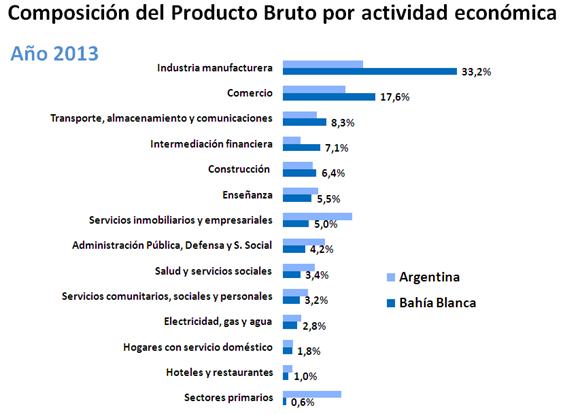 Para analizar más en detalle la conformación del Valor Agregado Bruto (VAB) de Bahía Blanca correspondiente a 2013, se presenta la participación de los distintos sectores de actividad. En la evaluación de los resultados se toman como referencia estas mismas participaciones en el orden nacional de acuerdo a los datos oficiales (INDEC).