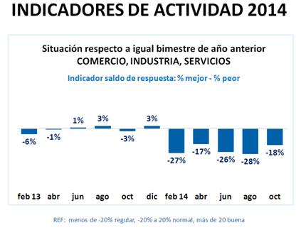 El indicador situación general generado por la encuesta CREEBBA permite obtener un rápido balance del año 2014. El gráfico presenta en cada bimestre el indicador saldo de respuesta de la situación general. El mismo se obtiene por diferencia entre el porcentaje de empresas que manifiestan estar mejor con respecto a aquellas que señalan estar peor, en ambos casos comparando la situación general de cada bimestre con respecto a igual período del año anterior. Los resultados se obtienen a partir de una encuesta realizada a casi un centenar de empresas representativas del medio.